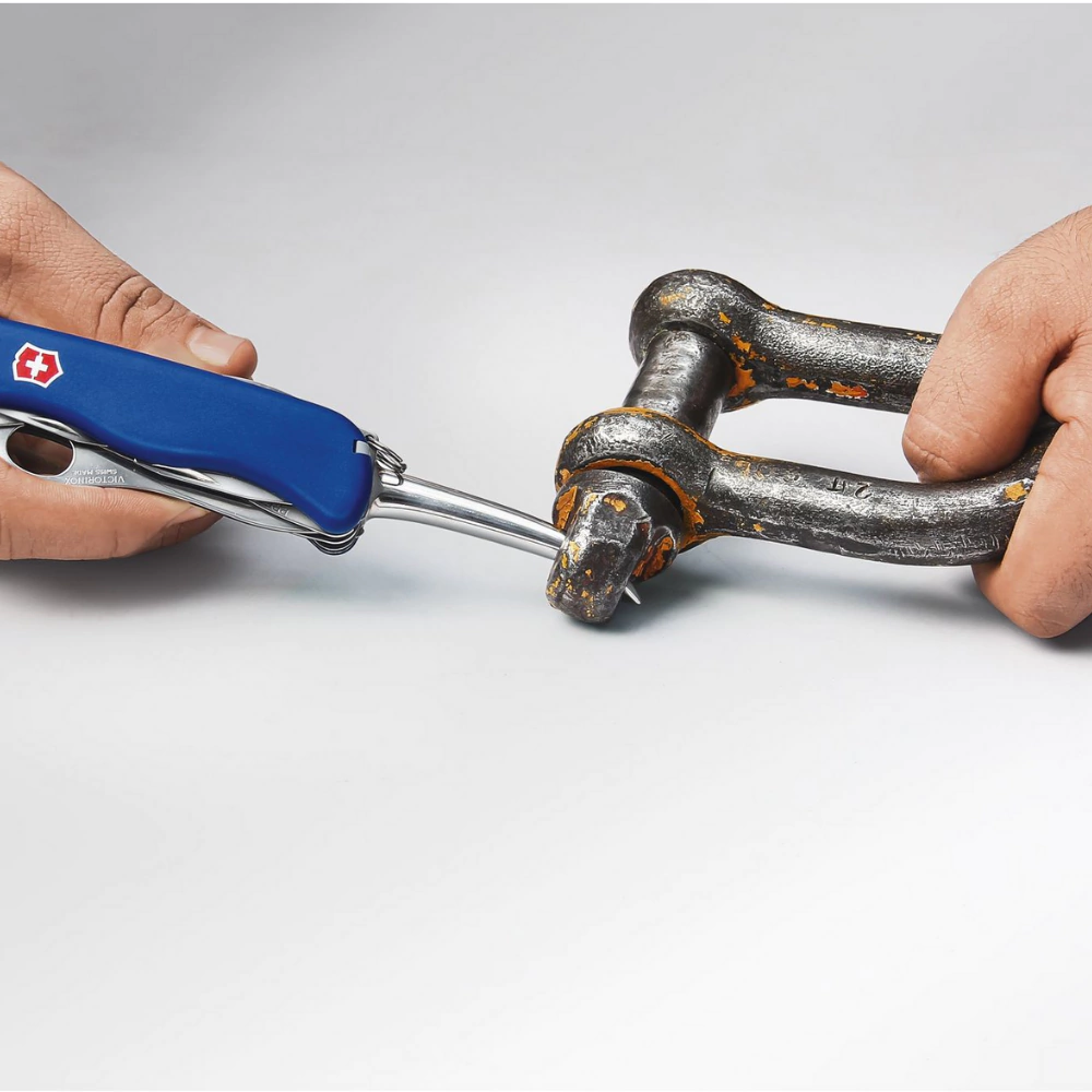 A compacta ferramenta Skipper Pro com 11 funções, é uma peça que oferece os recursos de toda uma tripulação de navio na palma de sua mão. Ela é equipada com a funcionalidade típica da Victorinox, combinando uma lâmina com trava e uma ferramenta específica para a navegação, essencial para qualquer aventura náutica: um desatador de nós robusto e com trava. Acompanha um cordão laranja vivo, que o torna visível até mesmo durante tempestades.
