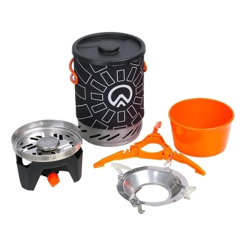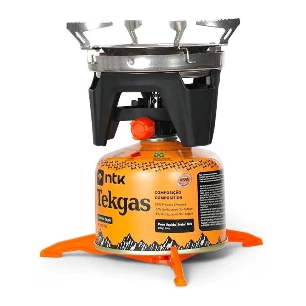 Projetado para ser rápido e fácil de usar, conta com acendimento automático e regulador de chama, oferecendo controle total durante o preparo dos alimentos. Acompanha suporte para estabilizar o cartucho, é compatível com ambos os diâmetros disponíveis no mercado, além de panela/jarra com empunhadura e suporte adicional para panelas convencionais de camping, ampliando a versatilidade do conjunto.