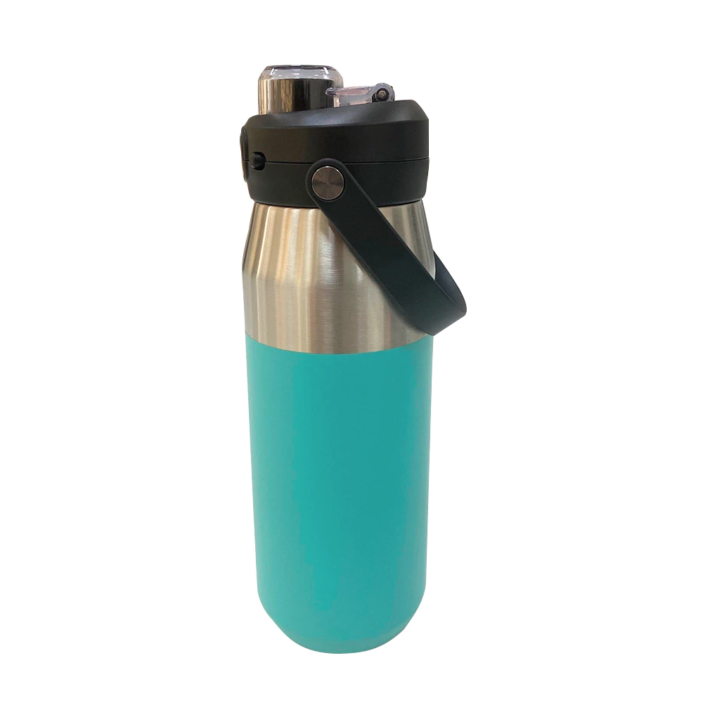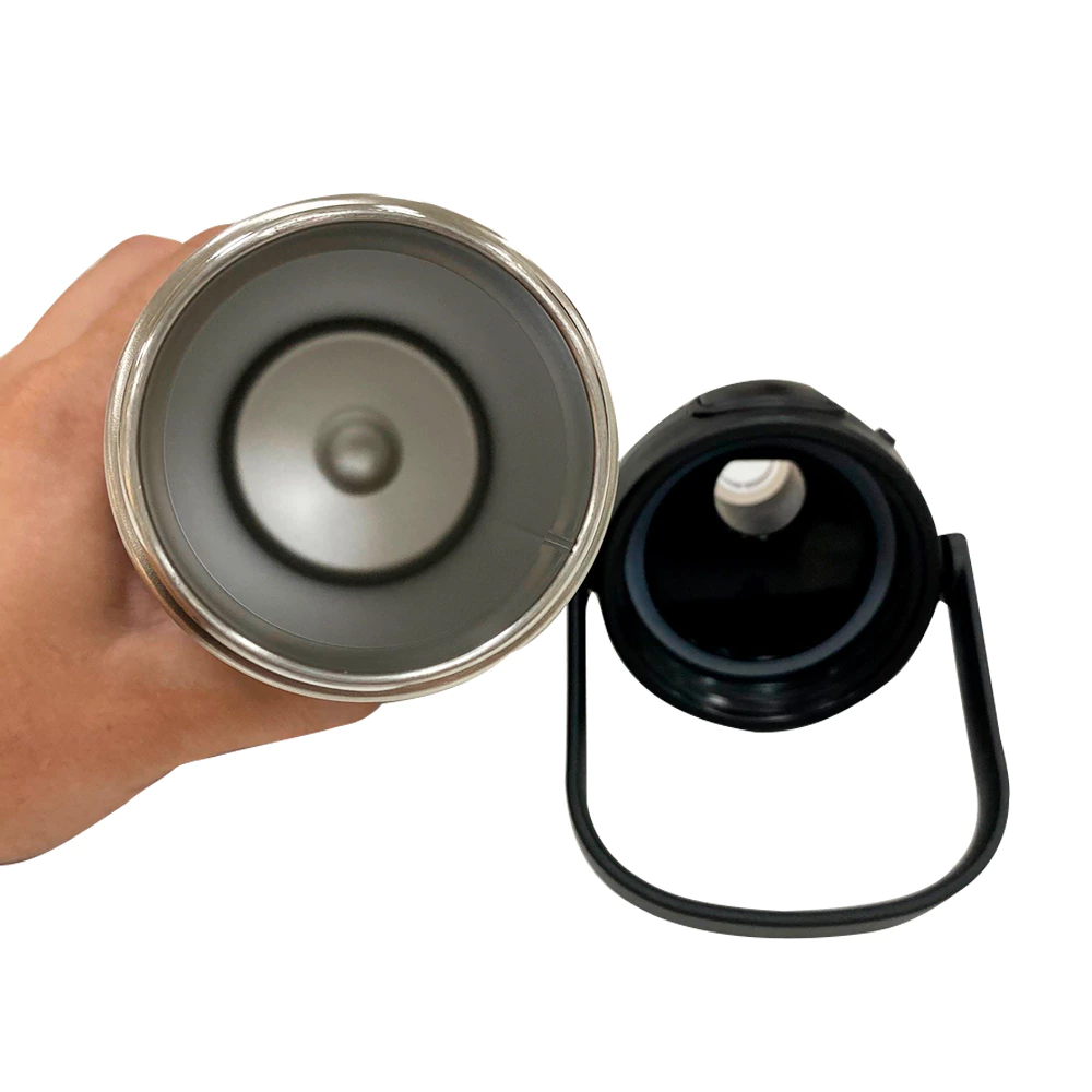 A boca da garrafa é larga, facilitando a colocação da bebida ou de pedras de gelo, por exemplo. Em sua tampa possui um botão para abrir a tampa menor, facilitando na dosagem na hora de beber, conta com uma trava na tampa evitando abrir, podendo ser transportado em segurança mesmo dentro de veículos e bolsas.