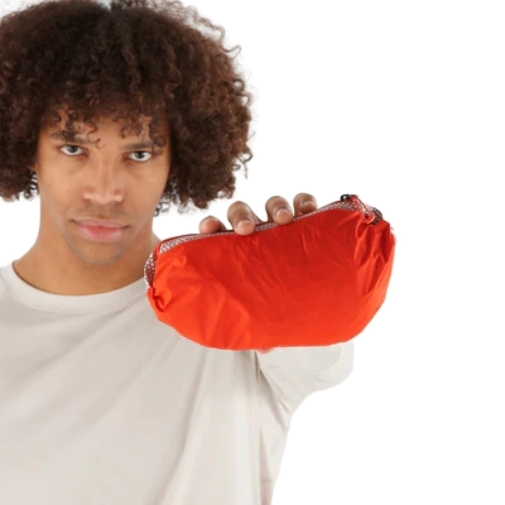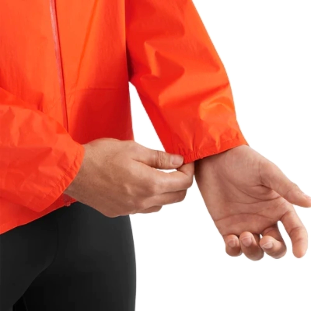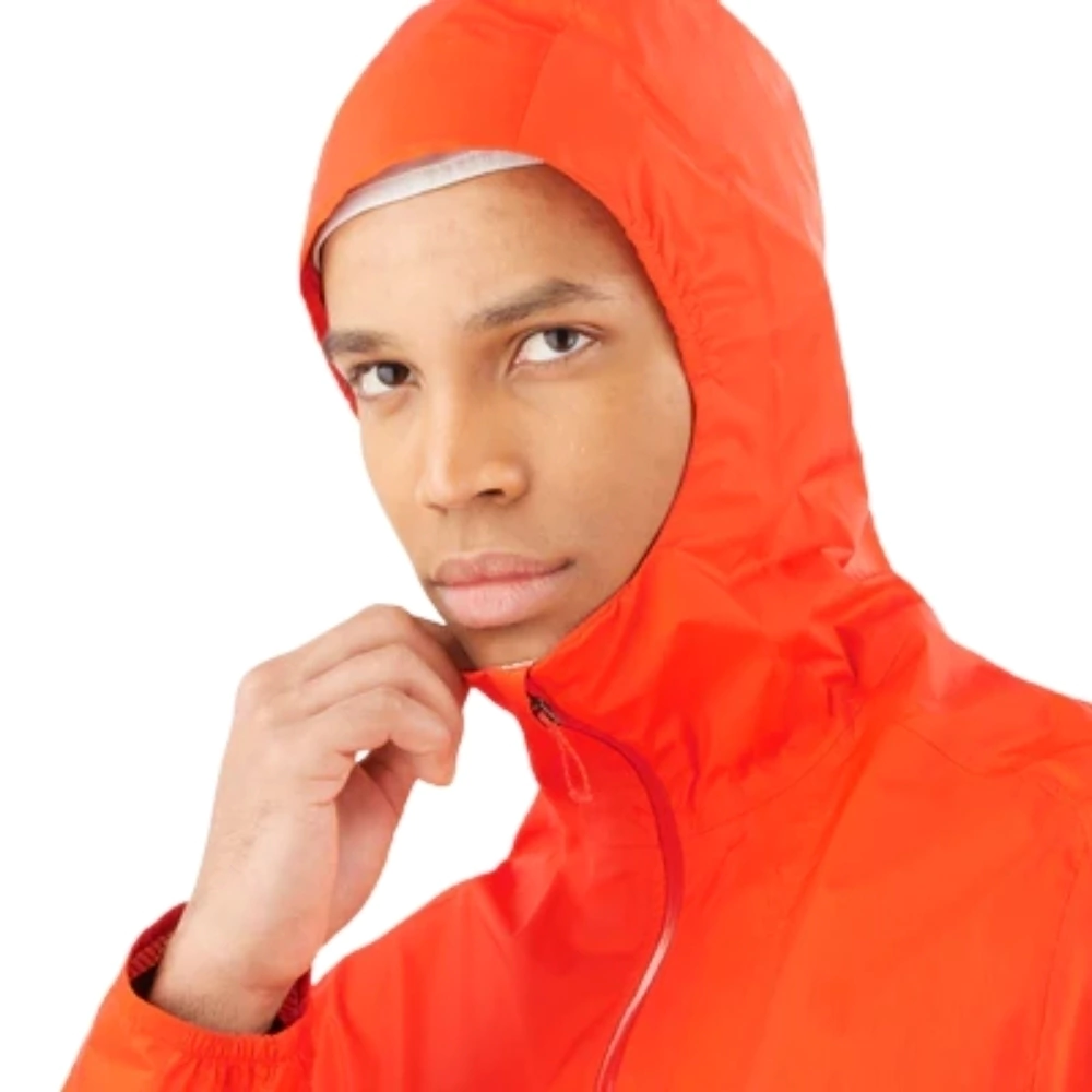 O capuz inteligente e o zíper impermeável mantêm o corpo seco e protegido, e o sistema de ventilação inteligente com botão frontal permite melhor controle térmico durante a atividade.