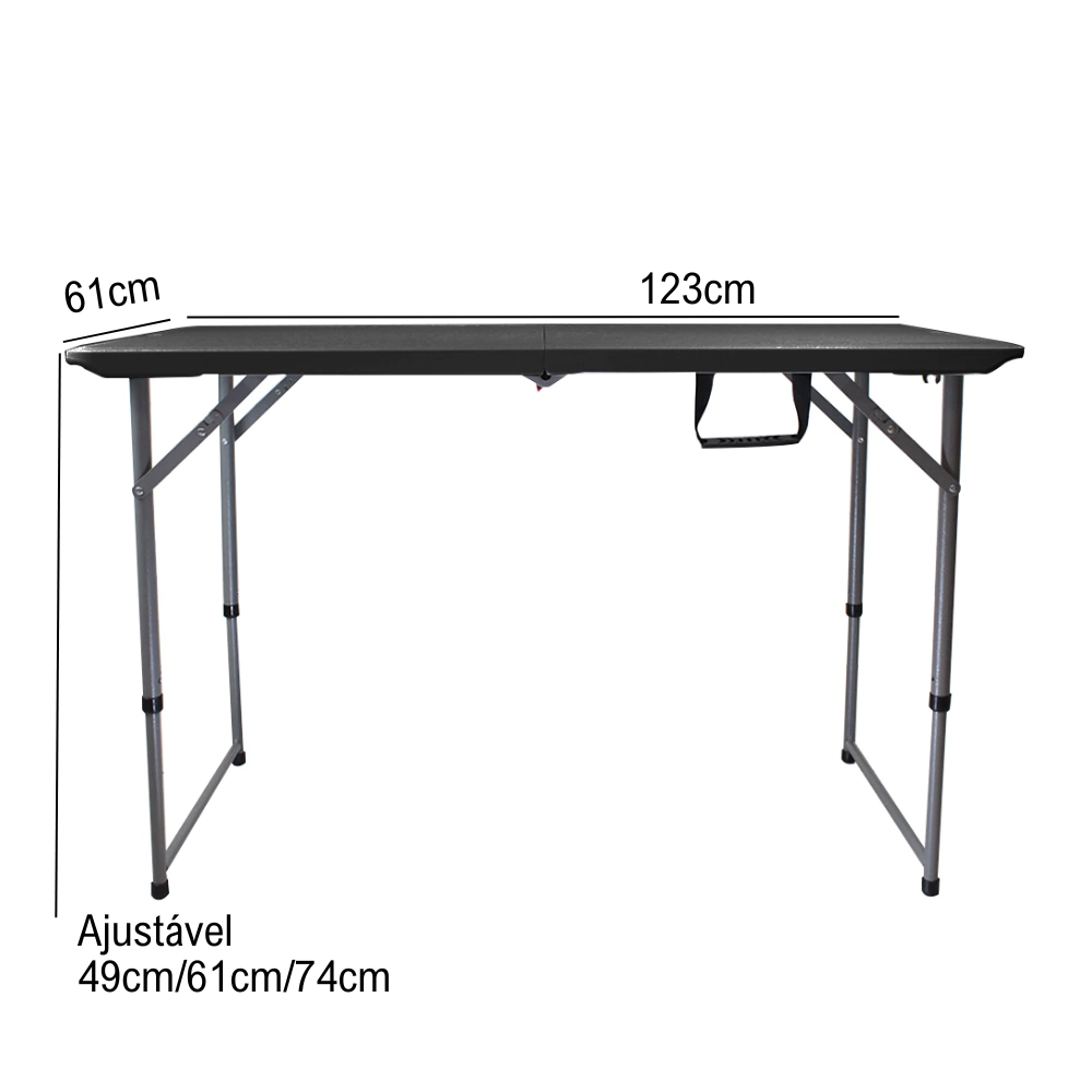 A mesa é fabricada em polietileno de alta densidade, garantindo resistência e durabilidade superiores. A presença de uma trava de segurança garante a estabilidade do tampo, enquanto os pés contam com um acabamento emborrachado anti-deslize, proporcionando estabilidade mesmo em terrenos irregulares.