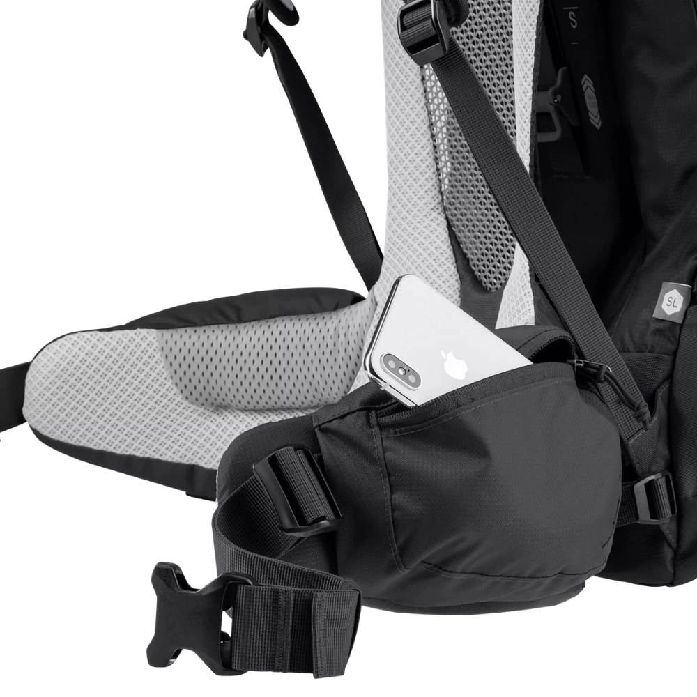 SL WOMEN'S FIT: O comprimento das costas do SL é específico para mulheres: em média, as mulheres têm costas mais curtas do que os homens. O sistema de transporte no modelo SL é, portanto, um pouco mais curto do que nas mochilas padrão Deuter. Além disso, o sistema de transporte é especialmente adaptado à anatomia feminina.