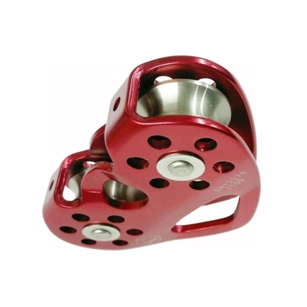 Polia dupla em linha, adequada para cabos de aço ou cordas com até 12mm de diâmetro. A fixação das roldanas às placas laterais é realizada através de rolamentos, permitindo uma velocidade de deslocamento de até 6 metros por segundo. As placas laterais são fabricadas em duralumínio anodizado, enquanto as roldanas são em aço inoxidável. Possui engates para mosquetões em ambos os lados (acima e abaixo das roldanas).